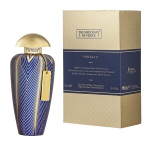 La fragranza Venetian Blue, fresca e carismatica, è elegantemente racchiusa in un flacone sui toni del blu. La sua decorazione rievoca le trame delle nobili stoffe veneziane che si fondono in un unicum con la forma elegante e virile del flacone e il suo blu intenso che rievoca il colore del mare. La virilità del flacone è resa dalla forma squadrata ulteriormente arricchita da un prezioso tappo argento su cui è incisa la rosa dei venti.